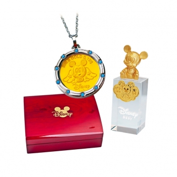 Disney迪士尼金飾 健康兩小無猜黃金/白鋼項鍊+米奇水晶印章木盒
